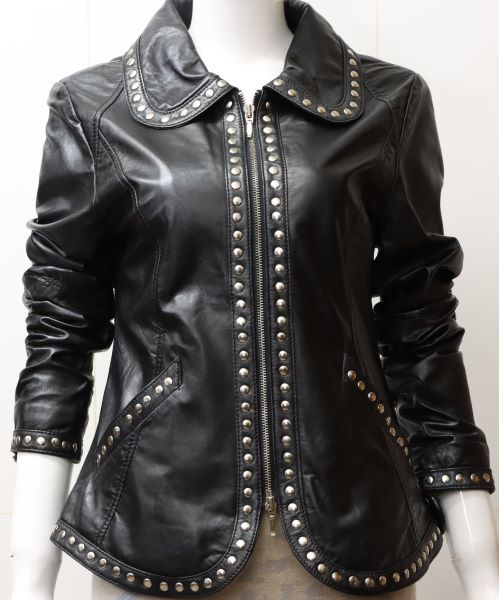 Casaco em pele de borrego preto com detalhes de tachas metálicas